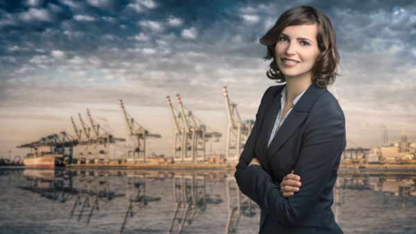 Attractive businesswoman with curly brown hair wearing a stylish jacket standing in front of a harbor or business port view smiling at the camera, upper body portraitCréditos fotográficos: istock LarsZahnerPhotography